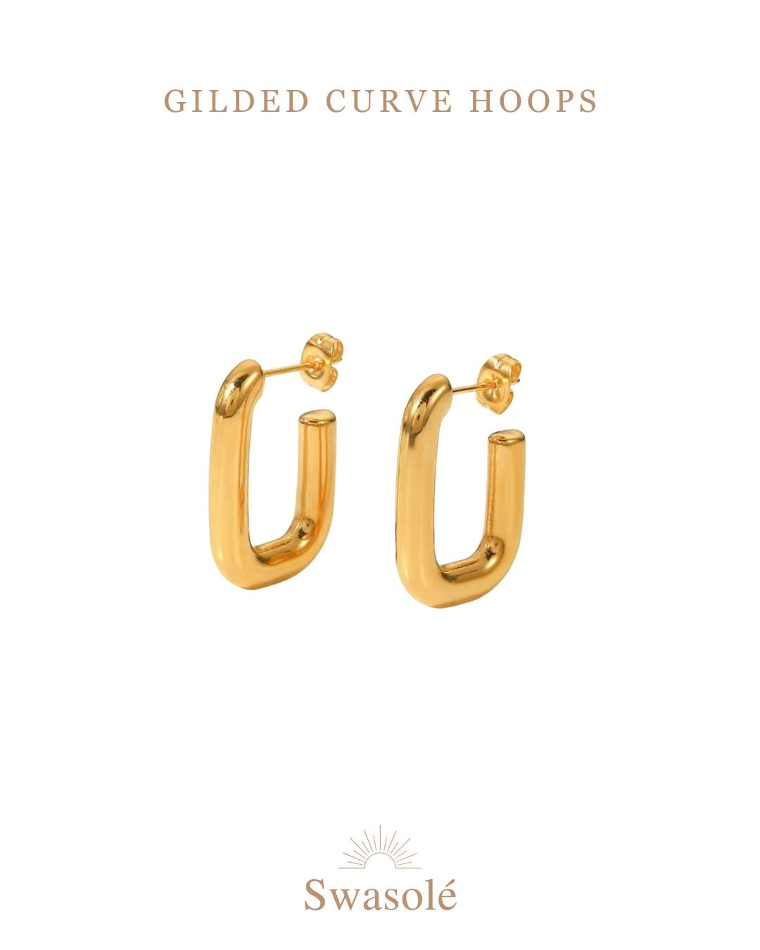 Elevate your everyday style with the Gilded Curve Hoops from Swasolé — a modern twist on timeless elegance. Crafted from high-quality metals and luxuriously plated with premium 18k gold, these hoops offer a bold yet minimalistic design that seamlessly complements any outfit.