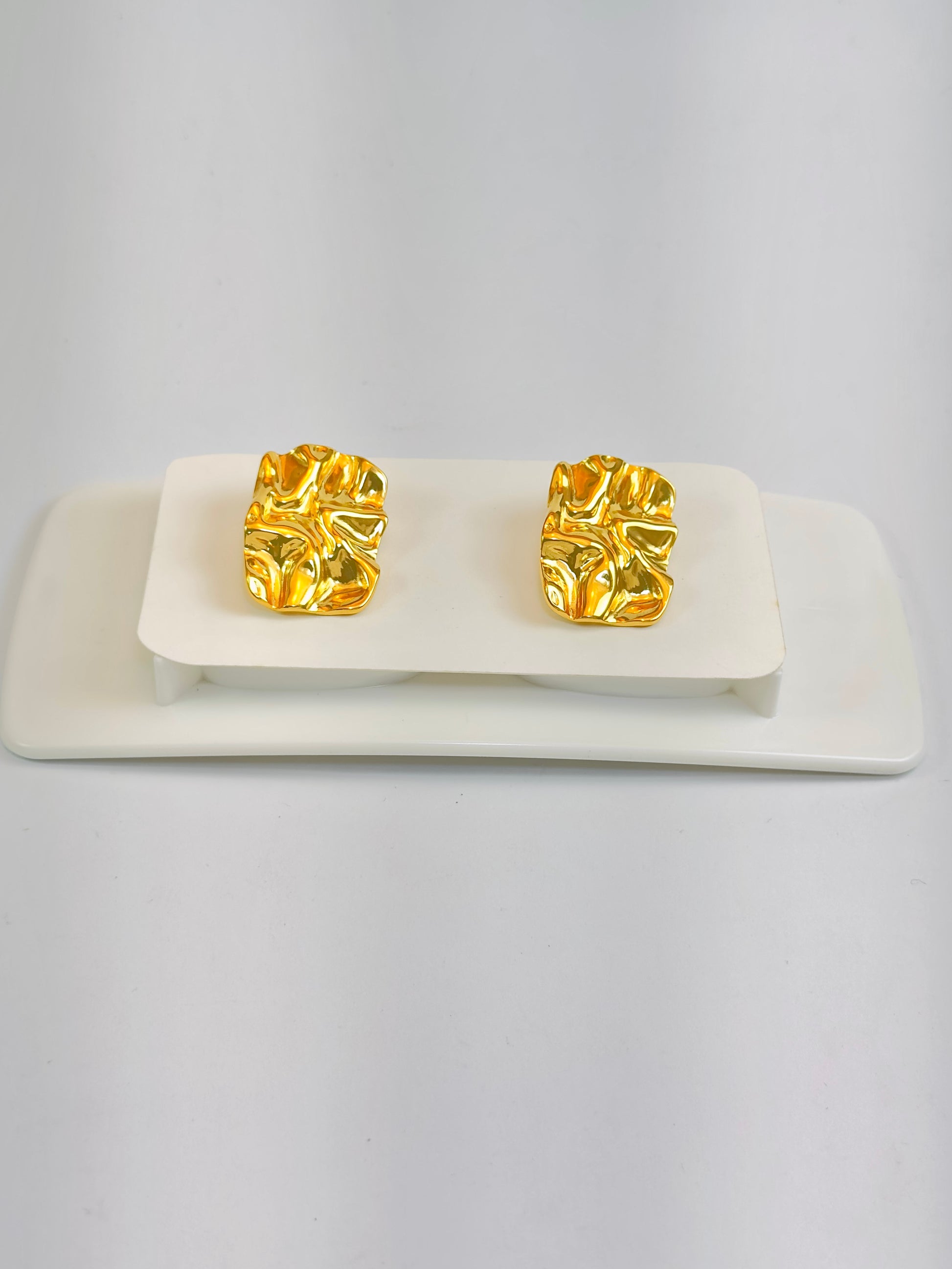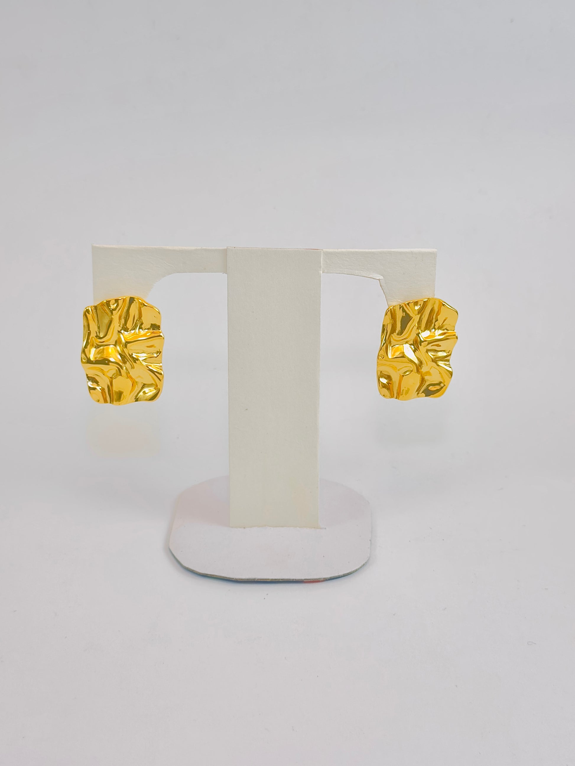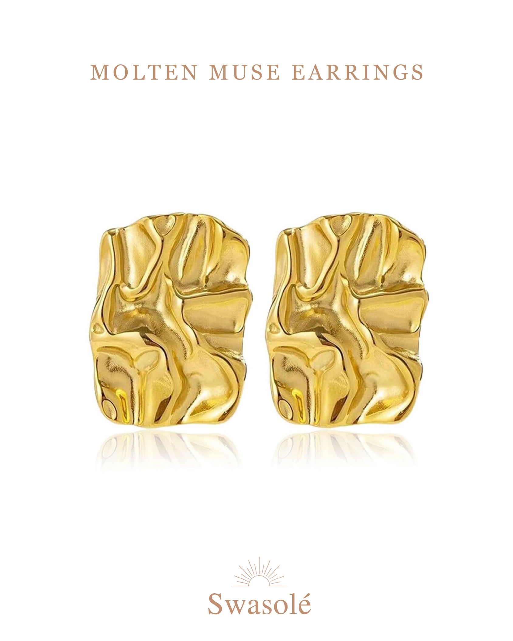 Crafted from durable stainless steel with a premium 18K gold plating, the Molten Muse Earring features a unique molten metal design. Measuring 3.19 cm by 2.35 cm and weighing 14.83 grams, this earring combines robust construction with elegant artistry, making it a sophisticated accessory for discerning wearers.
