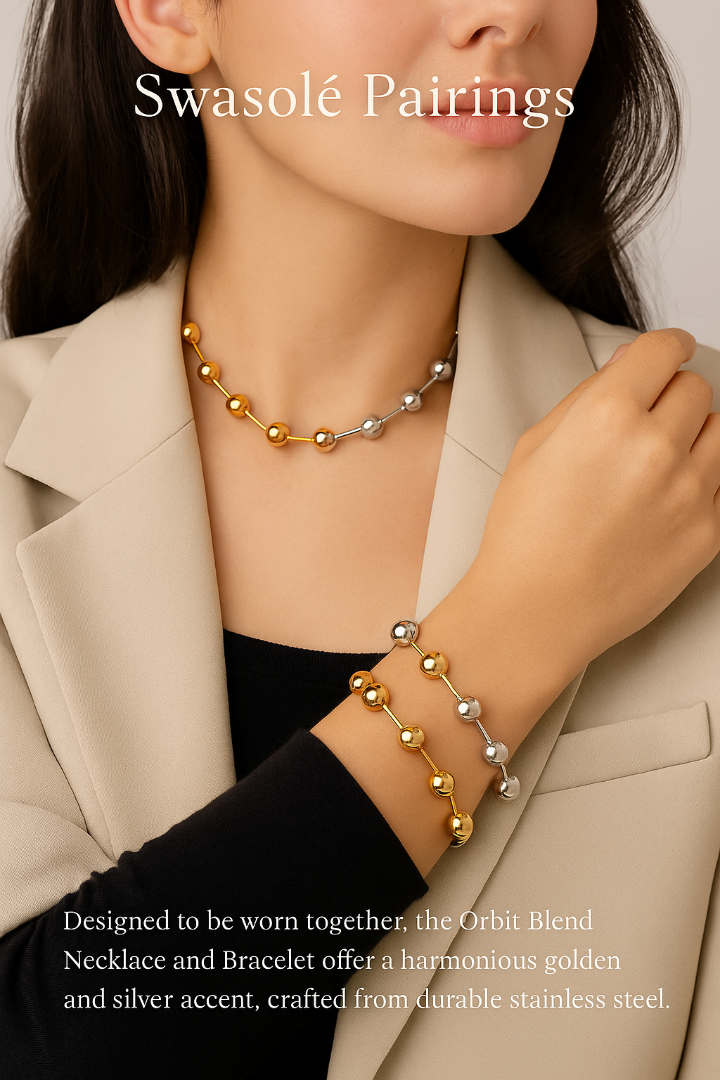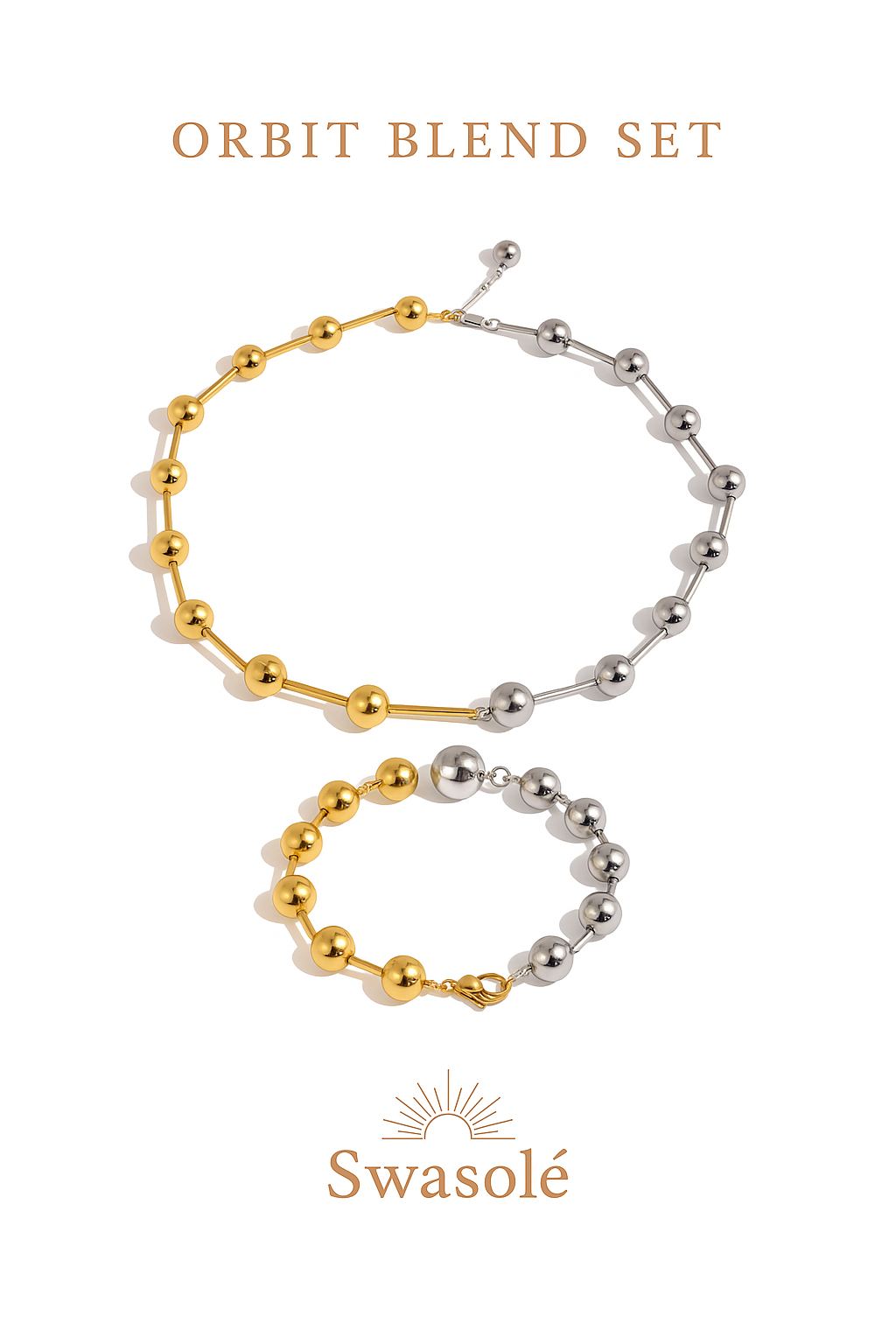 Step into the world of effortless style with the Orbit Blend Set, a signature pairing from Swasolé Pairings. Thoughtfully curated for those who love coordinated elegance, this set features the Orbit Blend Necklace and Orbit Blend Bracelet, perfectly designed to complement each other.