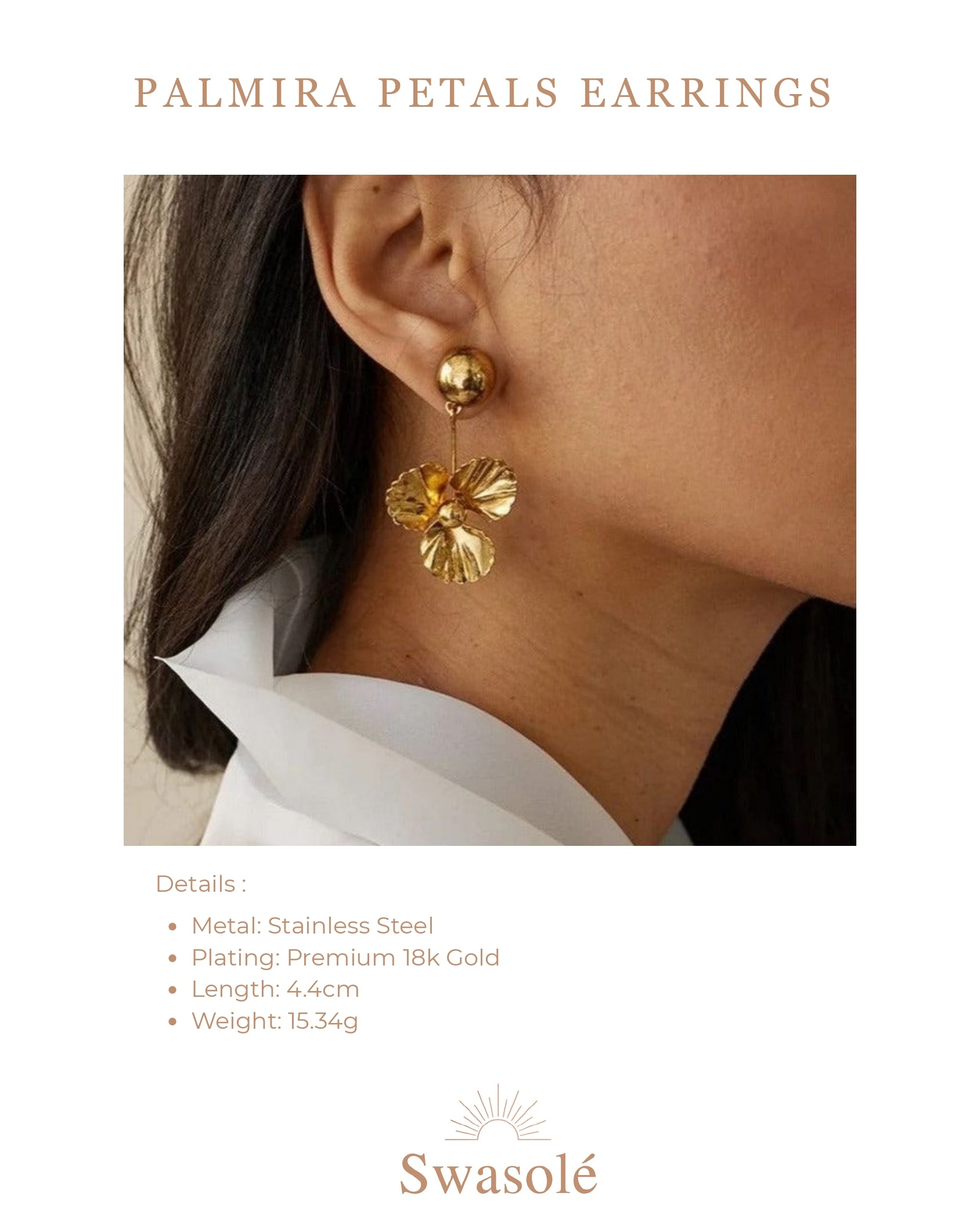 Crafted from stainless steel with a premium 18k gold plating, the Palmira Petals Earrings measure 4.4 cm and weigh 15.34 g. Their delicate flower-inspired design offers an elegant and refined look, perfect for adding a sophisticated touch to any outfit. Durable yet stylish, these earrings combine lasting quality with timeless beauty.