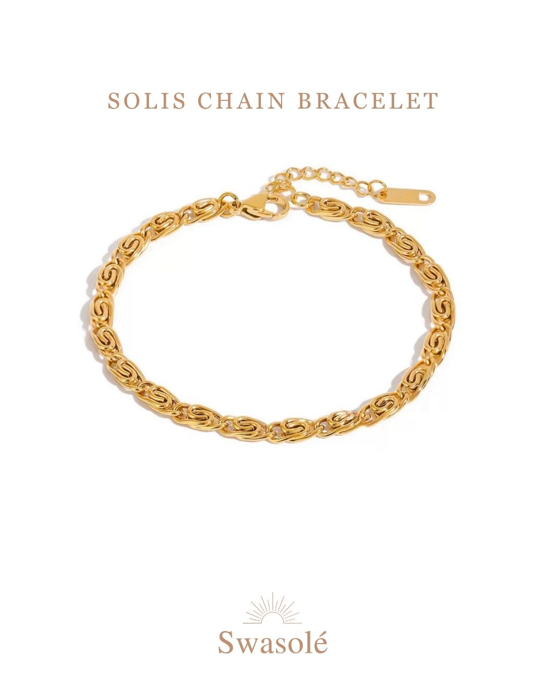 The Solis Chain Bracelet is where classic craftsmanship meets bold character. With its intricate loop design and radiant gold finish, this piece makes a confident statement on any wrist. Crafted from durable stainless steel and coated in premium 18k gold plating, it's a bracelet built for everyday elegance and long-lasting shine.