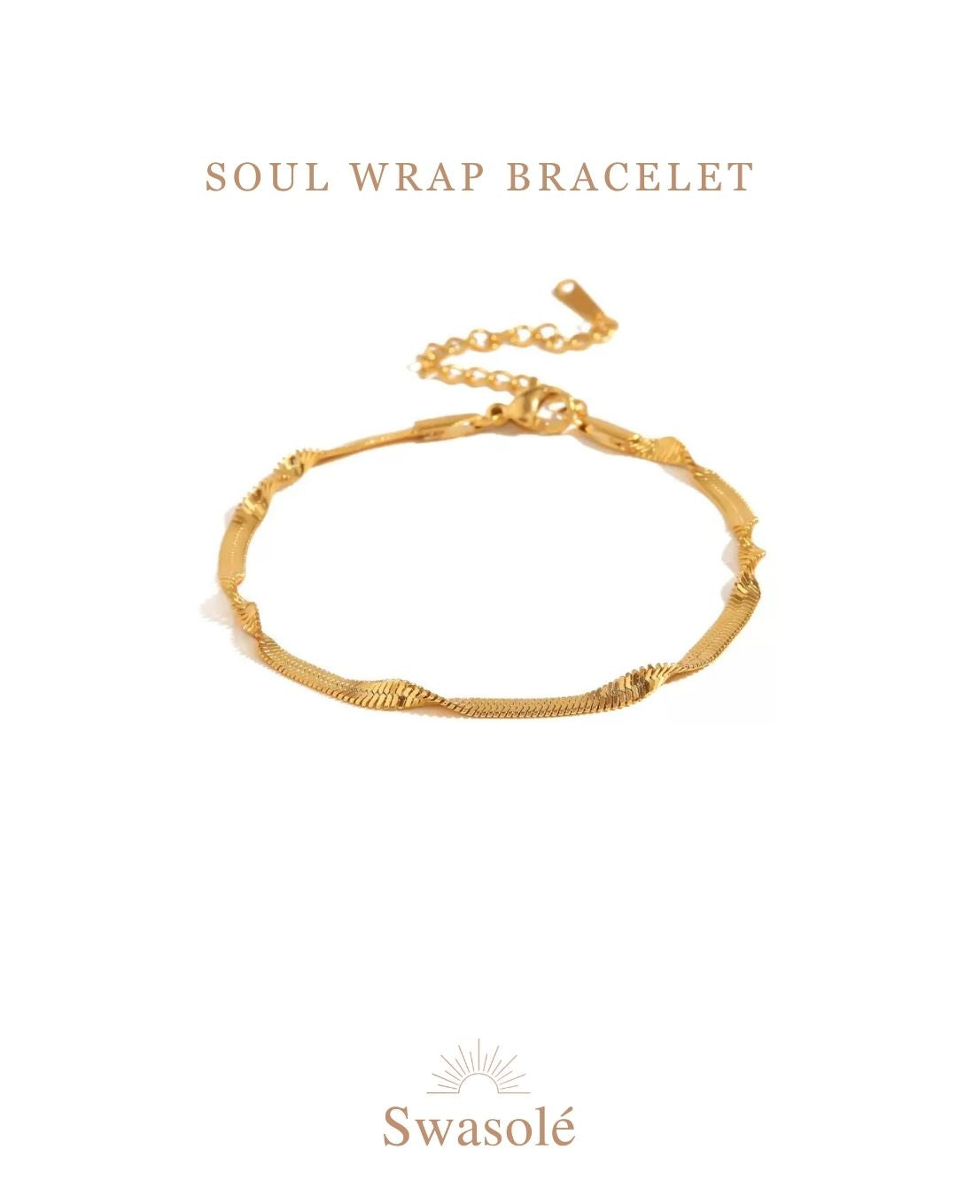 Add a whisper of golden charm to your wrist with the Soul Wrap Bracelet – a dainty yet distinctive piece that wraps your soul in timeless elegance. Made with stainless steel and finished in premium 18k gold plating, this bracelet is waterproof, sweat-proof, and hypoallergenic — perfect for daily wear without fading or irritation.