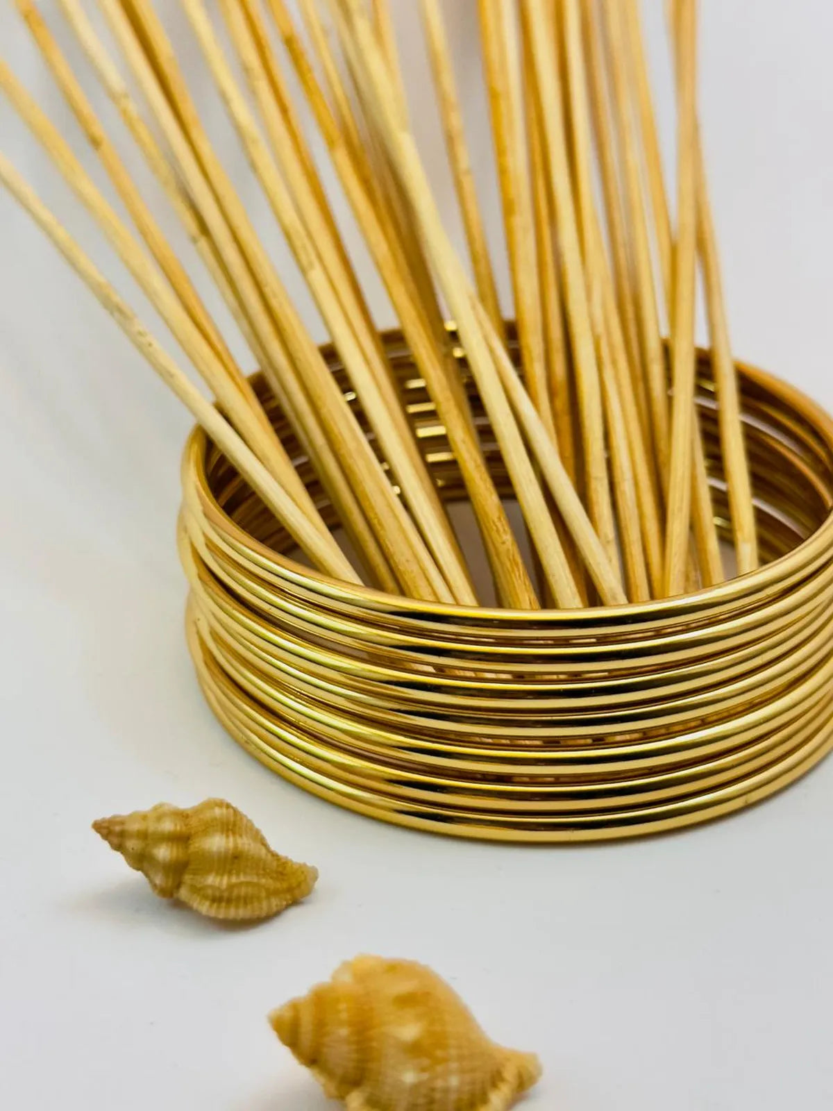 Crafted from high-quality stainless steel with a premium 18K gold plating, this set of five bangles offers exceptional durability and water resistance. Each bangle features an inner diameter of 6 cm and a combined weight of 34.6 grams, ensuring a comfortable yet substantial feel. Designed for lasting wear, these bangles blend elegance with resilience, making them a refined addition to any jewelry collection. Size - 2.4 , 2.6
