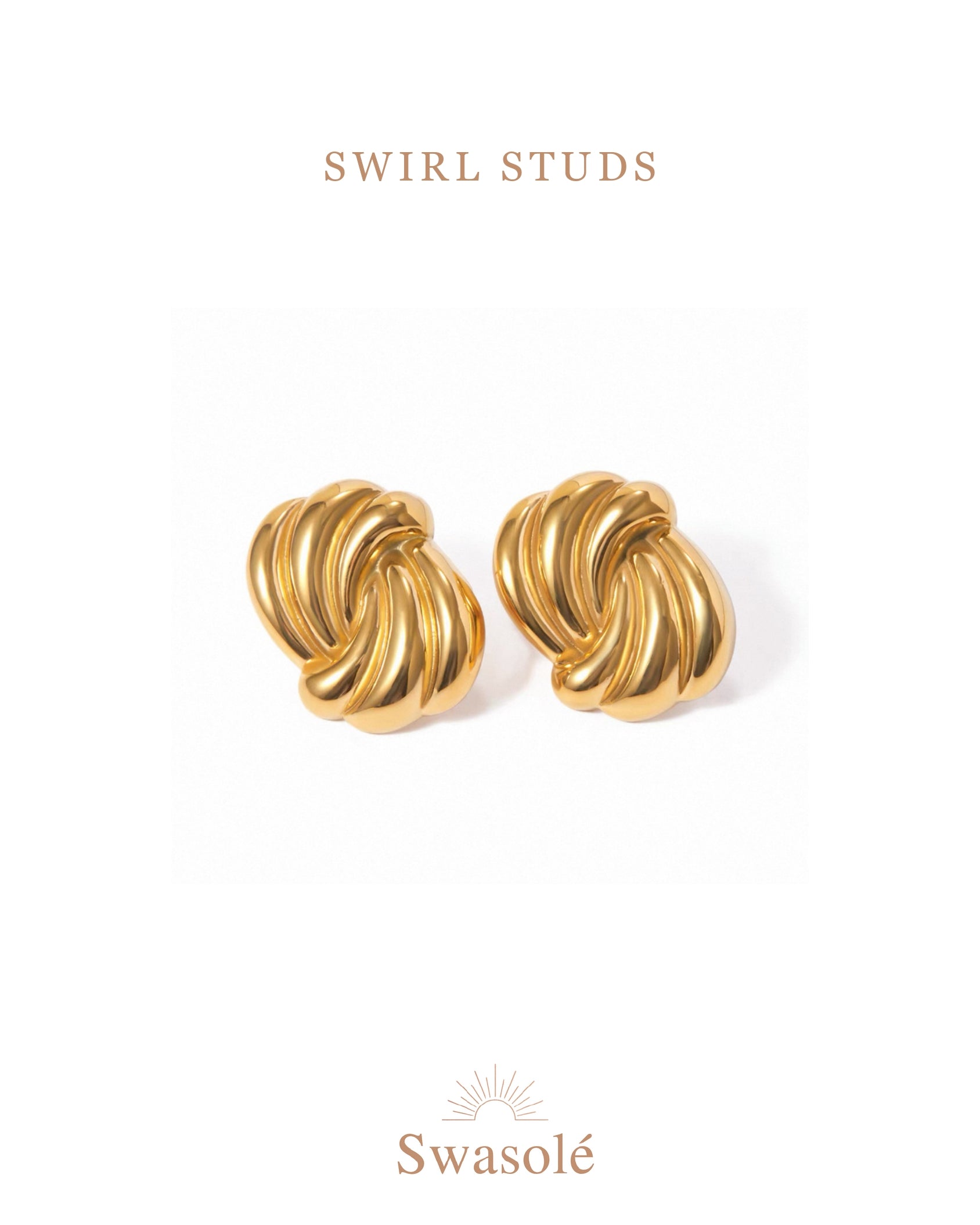SWIEL Studs are precision-crafted from stainless steel with a premium 18K gold plating, featuring a sophisticated wave pattern within a geometric shape. Designed to be waterproof, these studs maintain their shine and structural integrity even with regular exposure to water, making them ideal for everyday wear. With a 16g gauge and compact size of 2.7 cm by 2.12 cm, they offer both durability and refined style.