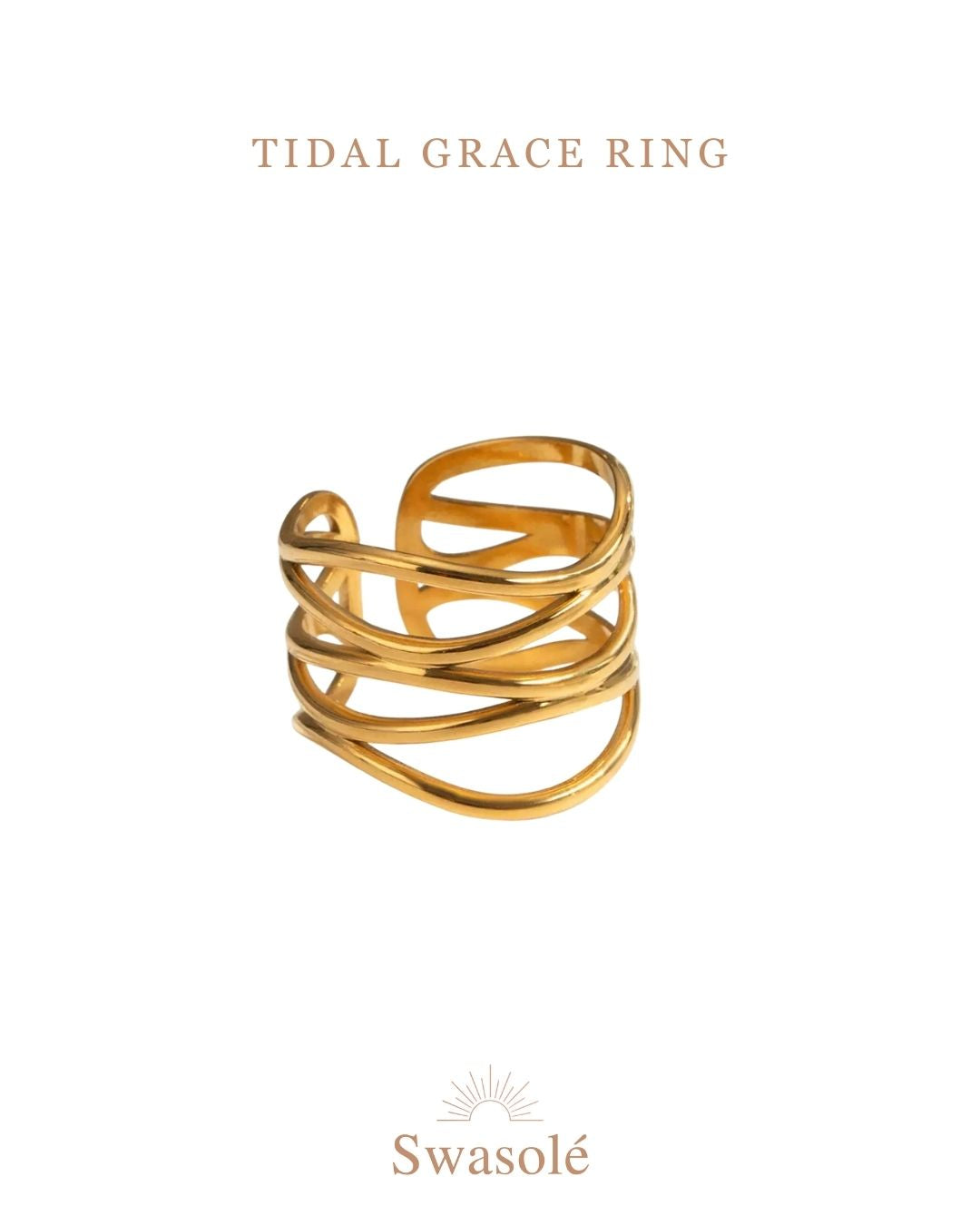 With its fluid, wave-like silhouette, the Tidal Grace Ring is the perfect accessory to elevate your style — whether casual or refined.